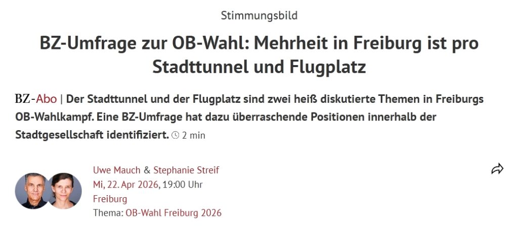 - Reaktionen auf Beitrag in der Badischen ZeitungAm 23. April, während des OB-Wahlkampfes veröffentlichte die Badische Zeitung eine von ihr in Auftrag gegebene Umfrage (IM Field GmbH: „Die richtigen Fragen – die Richtigen fragen!“ ) : „Freiburg pro Stadttunnel und Flugplatz“. Hier Reaktionen zu diesem Beitrag und zu den Aussagen der OB-KandidatInnen