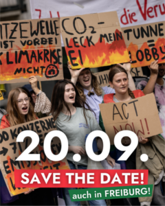 FFF: „Wir gehen am 20. September gemeinsam auf die Straße und demonstrieren für eine klimagerechte, lebenswerte Zukunft. Wir treffen uns um 13 Uhr am Stühlinger Kirchplatz für eine Kundgebung, im Anschluss werden wir mit einer Laufdemo durch die Stadt ziehen. Kommt vorbei, nehmt Familie und Freund*innen mit, lasst uns unser Anliegen und die Demo groß machen!“